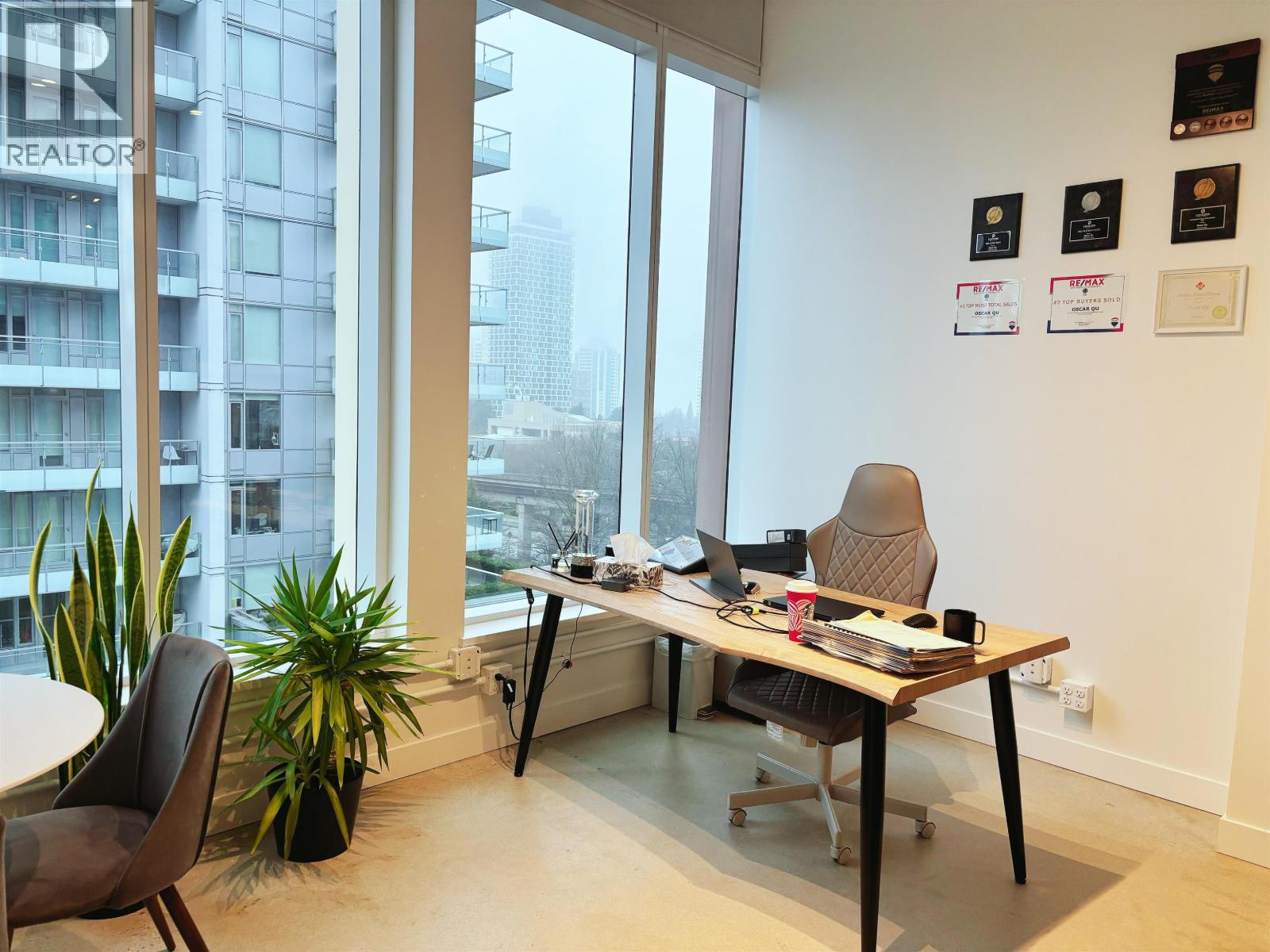 This 569 sq. ft. AAA office is located on the 6th floor of Sun Tower, offering a stunning city view with two sunlit windows. Situated in the heart of Metrotown. Just a short walk from the Metrotown SkyTrain station. The office is divided into 2 sections by a metal and glass partition with a door. The outer area is equipped w/ reception desk, cabinets, sink, microwave, refrigerator and dishwasher, making it functional, efficient, and convenient. The Centre at Sun Towers offers premium strata office space with a dedicated lobby and elevators, individual HVAC, high ceilings, and floor-to-ceiling windows. Exclusive services include concierge assistance, private mailboxes, meeting room bookings, and high-speed fiber-optic connectivity. The building also features a restaurant, clinic, daycare and two levels of underground parking, all conveniently located next to the SkyTrain in Downtown Burnaby. (id:9345)...