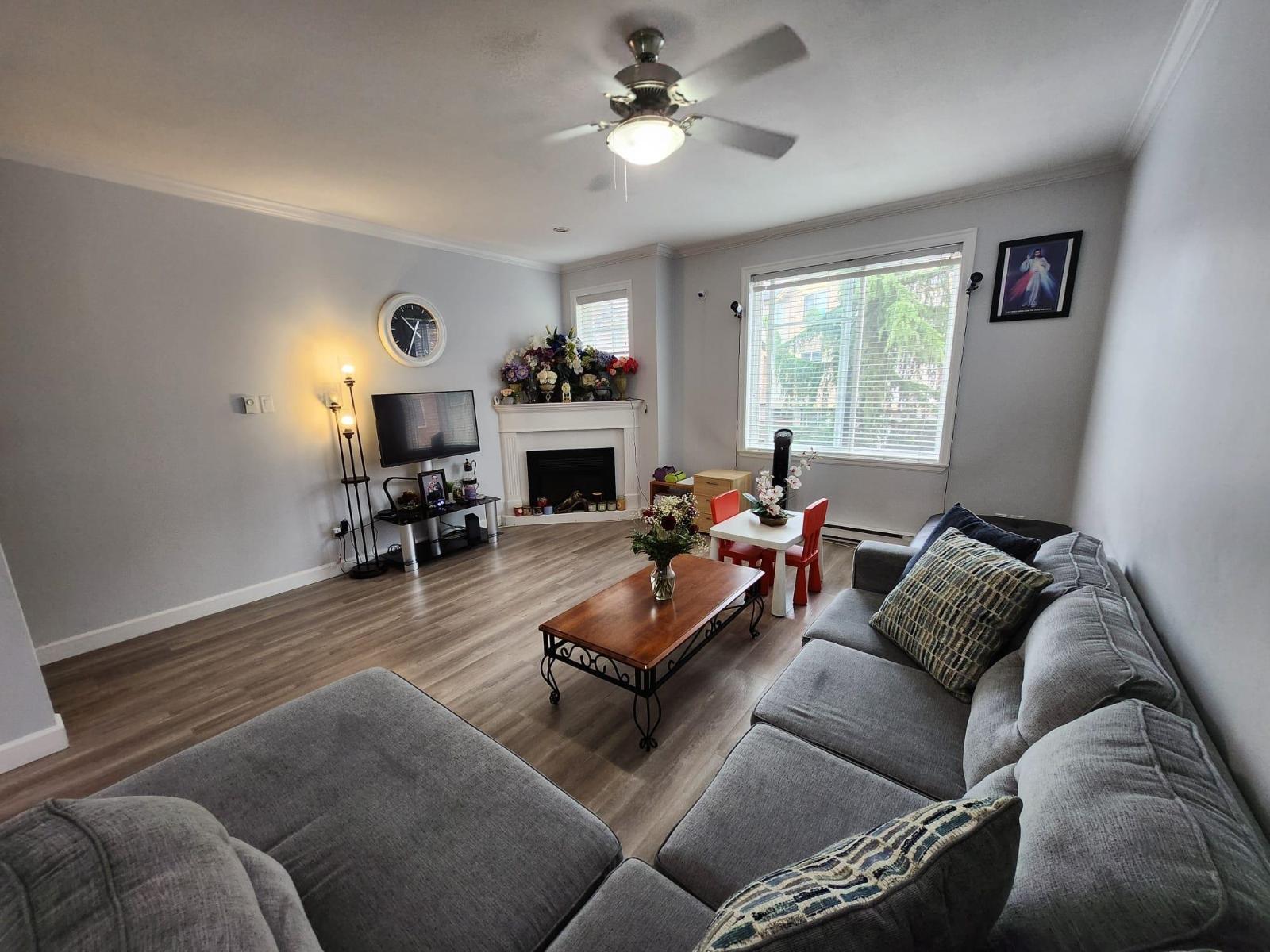 Welcome to Fleetwood, just off Fraser Highway. Bright, south facing, spacious 1677sqft townhouse in Fleetwood Rose Garden, offers 3 bedrooms, 2 and 1/2 bathrooms. Possibility to make 4th bedroom in the basement. Quiet inside unit. This unit was show room, more fine finishing than other units, 8'11" ceiling, cozy fire place, rich laminate floor and crown moulding throughout main warm carpet on bedrooms; maple cabinets, Sakura hood fan, balcony off kitchen; fenced yard, and security system installed. Close to shopping mall, Recreation centre, community centre, library, , Starbucks, restaurants, park, bus and easily access to Skytrain. Frost Road Elementary and North Surrey Secondary at walking distance. (id:9345)...