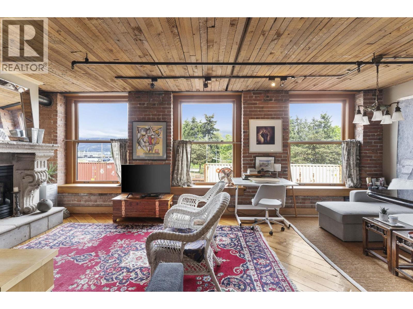 In vibrant Gastown, The Captain French offers a unique blend of heritage architecture and modern flair. This generously sized 1 bedroom loft showcases timeless details brick feature walls, exposed wood beams, rich flooring that add depth and personality. Oversized windows capture panoramic views of the mountains, adding natural beauty to the everyday. The open concept living area includes a gas fireplace for cozy evenings, while the kitchen offers great layout with a breakfast bar and plenty of counter space. Whether it's a quiet workspace, extra storage, or a reading retreat, the flexible layout delivers. All of this just steps from Gastown cafes, boutiques and more. Residents enjoy access to a rooftop patio with BBQ, secure underground parking and a spacious storage locker. (id:9345)...