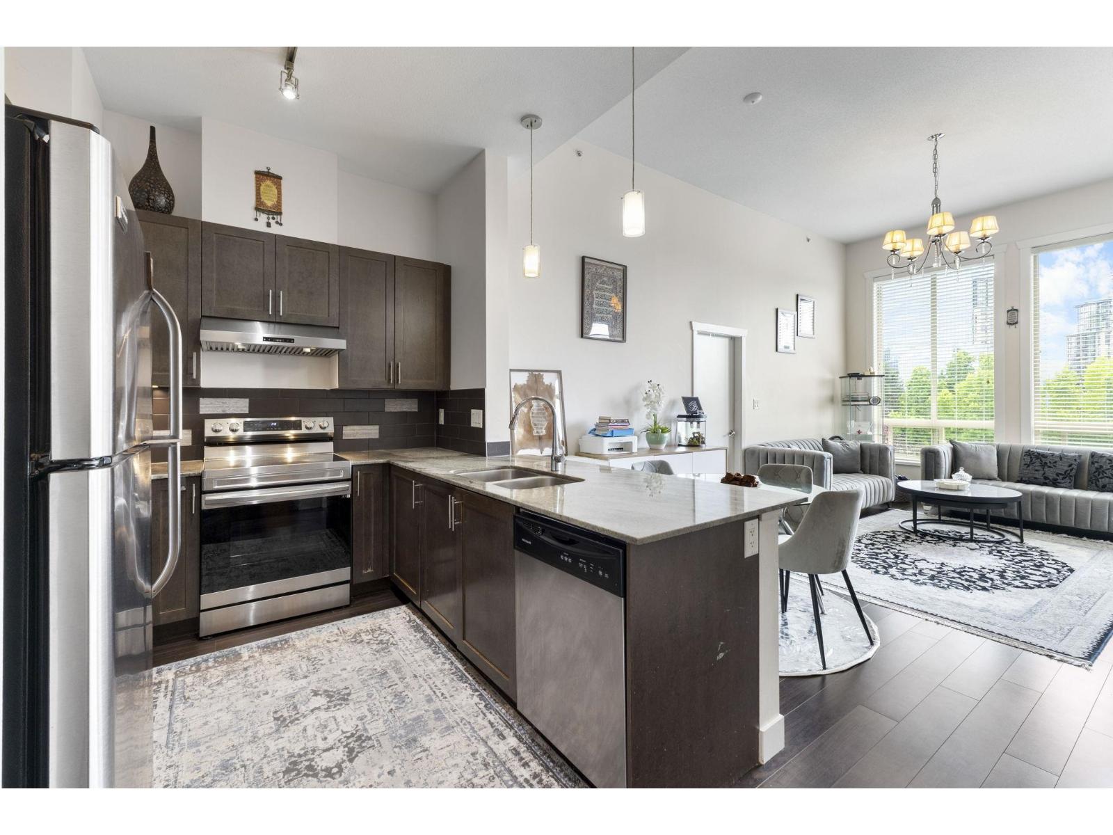 You'll be stunned when you first walk into this amazing 2 BED, 2 BATH penthouse unit, soaring 14' ceilings and oversized west-facing windows pour sunlight into the airy open-concept living space. The modern kitchen features granite counters, maple cabinetry, stainless steel appliances, and porcelain tile flooring. The spacious primary bedroom includes a sleek ensuite with a walk-in shower, while the second bedroom is paired with a full bath with tub. Complete with in-suite laundry, 2 PARKING STALLS, common storage, and a massive private patio perfect for summer lounging. All just steps from Gateway SkyTrain, grocery stores, banks, and more! Amenities include a furnished lounge, gym, conference room. (id:9345)...
